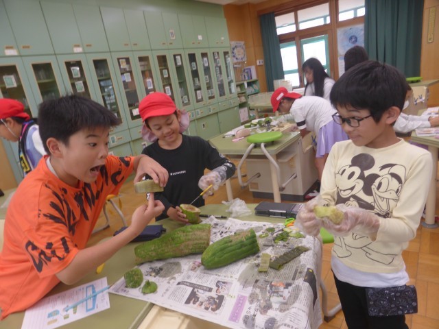 ゴーヤとヘチマの違いを観察したりヘチマから種を集めたり楽しそうに活動していました。