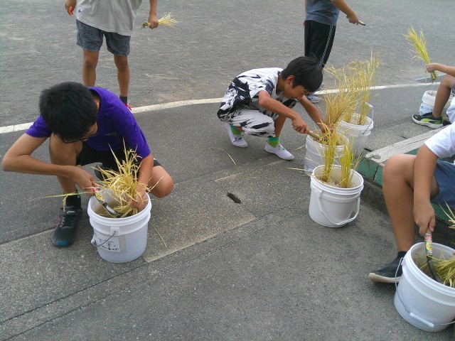 今日は自分たちで育てたバケツの稲刈りをしました!