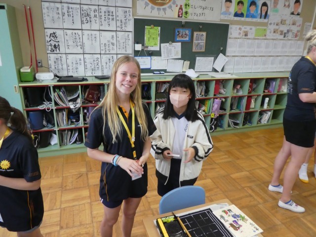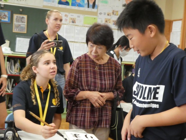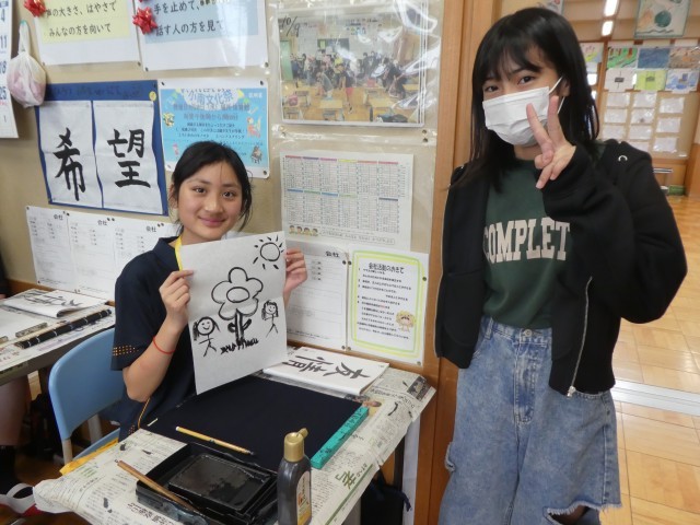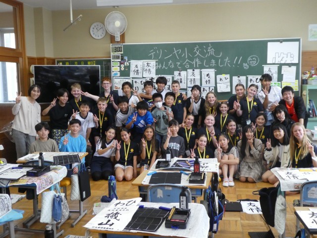 本日、オーストラリアのデリンヤ小から留学生が来ました。6年1組では、書写の学習を通して交流しました。墨を使って自分の名前を伝えたり、一文字ずつ・一画ずつ交代して字を書いて合作をつくったりして楽しく交流できました。留学生のみんなも字を書くのが上手ですね!クラスの子たちからも「Nice!」「Good job!」などの嬉しい声かけがありました。