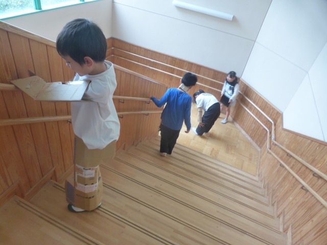 段ボールで関節を固定し、曲がらないようにして運動に取り組みました。