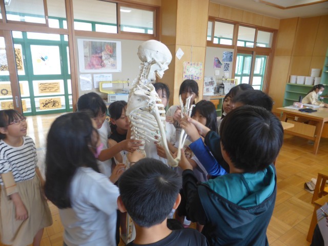 人体模型で骨と関節を確認し、骨と関節の多さに驚いていました。