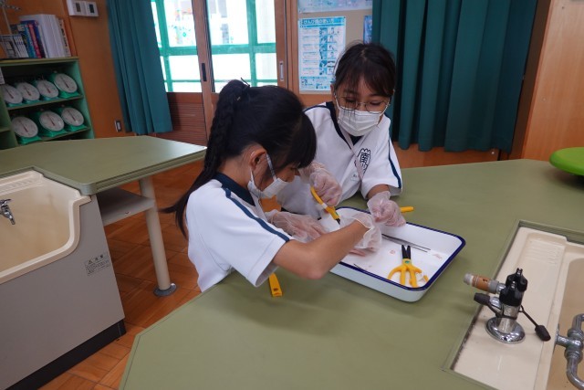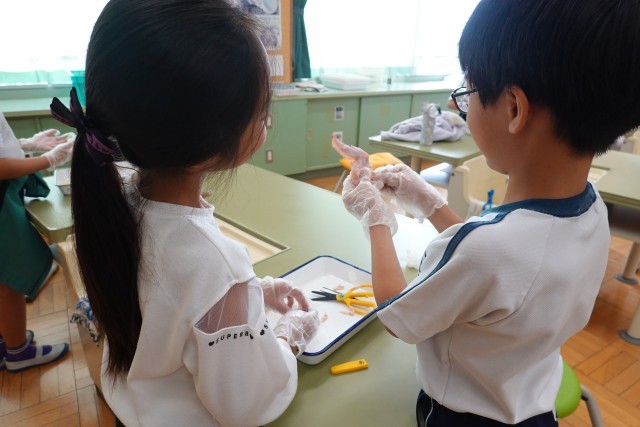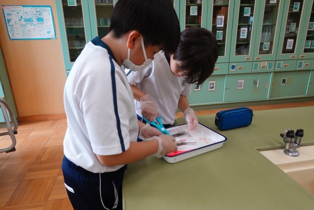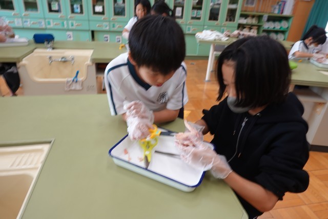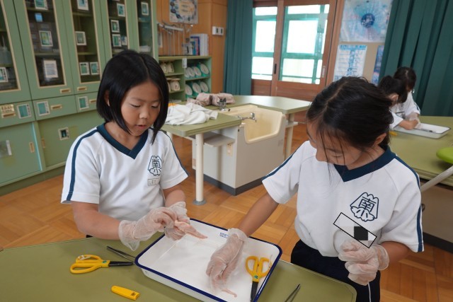 手羽先を観察して、筋肉と骨のしくみを調べました。ふだん、食べることはあっても理科的に観察することはないと思いますが、きん肉によって骨が動く体のしくみを目の当たりして、驚きと学びがあったようです。