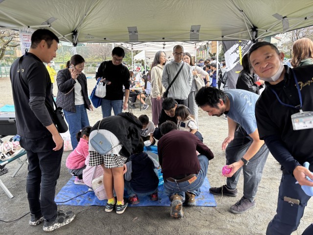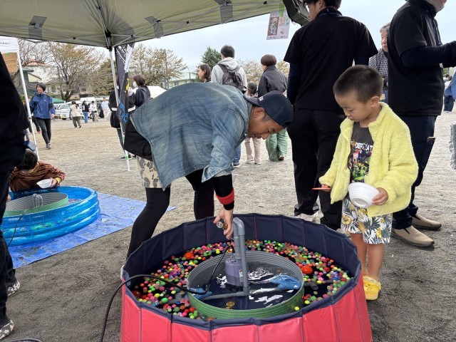 朝早くからスーパーボールすくいコーナーを設営して、子どもたちを出迎えます。