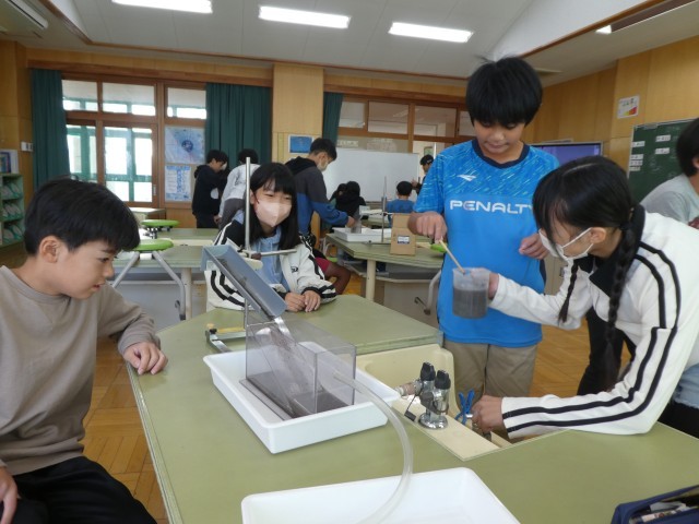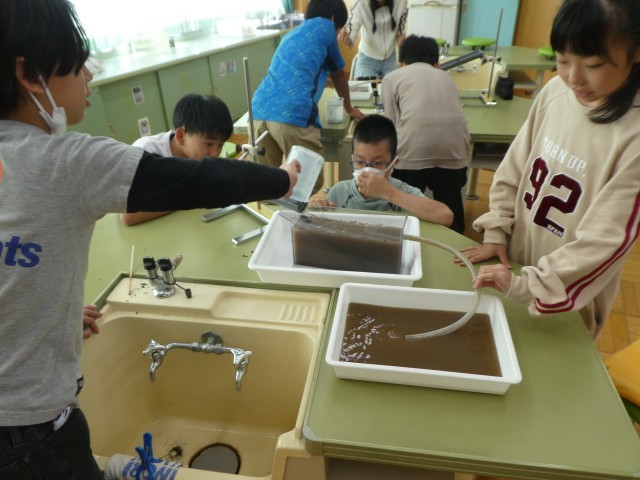 地層ってどのようにしてできるのかな?流れる水のはたらきをもとにして考えてみましょう。泥・砂・れきは沈むまでの時間差がありますね。そこから推測すると・・・?