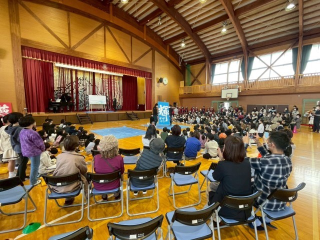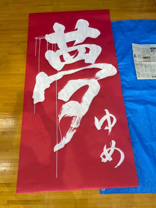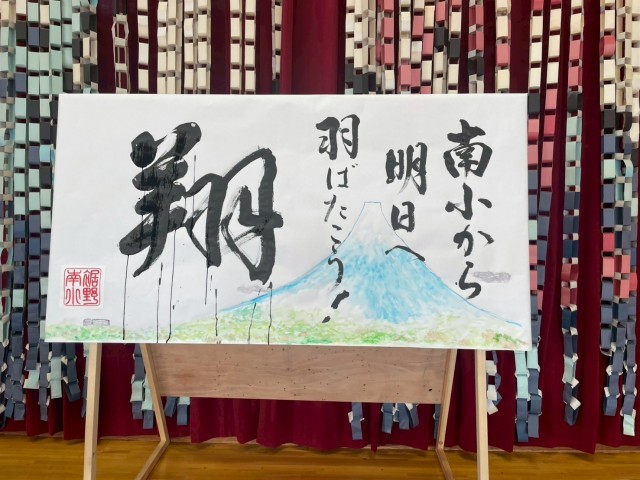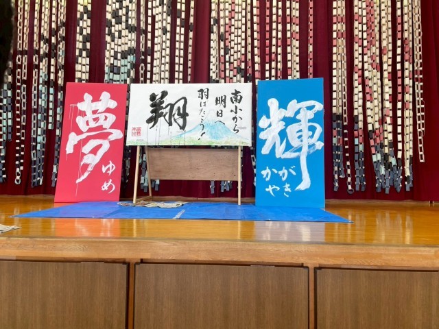 20周年記念行事は予定よりも短縮されましたが、地区の伝統的なしゃぎり演奏と、本校学校運営協議委員で書道家伊藤さんと、音楽担当の飯島先生による書道パフォーマンスが行われました。「夢」と「輝」、そして「翔」の書字から、きっと感じたものがあったと思います。皆さんへの未来に向けたメッセージだと思いますが、皆さんはどんなことを感じましたか。