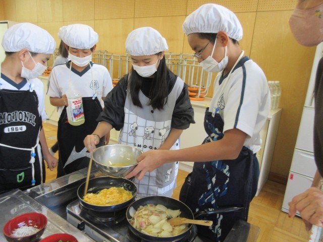 6年生の家庭科では、班ごとに栄養バランスを考えた献立を立て、その料理を実際に作る学習を進めてきました。