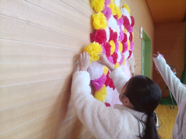 12月23日に行われる20周年記念 感謝祭の準備をしました。みんなでお花を作り、体育館の飾り付けをして、お祝いをする気持ちを高めました。