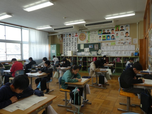 みんな真剣に問題と向き合っています。6年生までの学習がどれだけ定着しているでしょうか?テストって、ついつい問題を解いて「はい、おしまい!」としがちですが、分析をし、今までの学習の仕方を振り返り、そして中学校の学習へつなげていきたいですね。