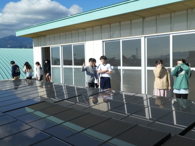 6年生理科「わたしたちの生活と電気」で様々な発電の仕方を学習しました。「そういえば、南小にも太陽光で発電する場所があるじゃん!」という話題になり、実際に見てみよう!という流れに。なかなか入ることのできない屋上でみんなテンションが上がってますね♪