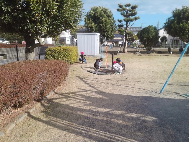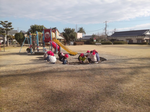 理科「冬の生き物」の学習で、伊豆島田公園に冬の生き物探しに行きました。木の下の方を見たり、鉄棒下のマットをめくったり、砂場の砂を掘ったりと、夢中になって生き物探しをしました。