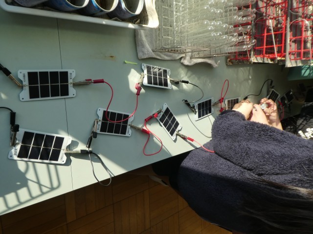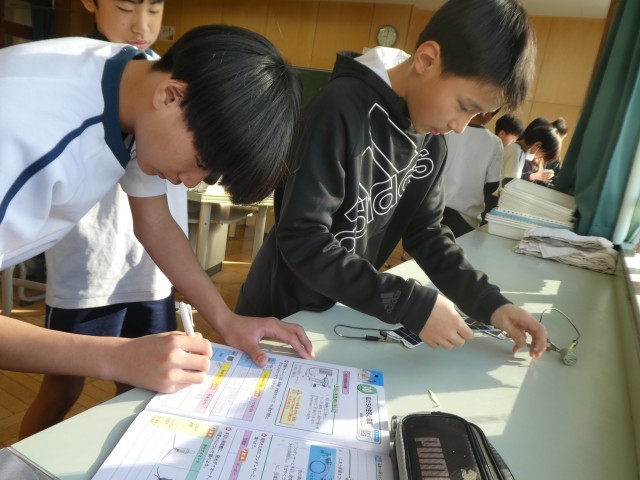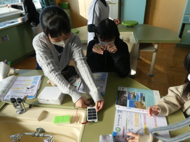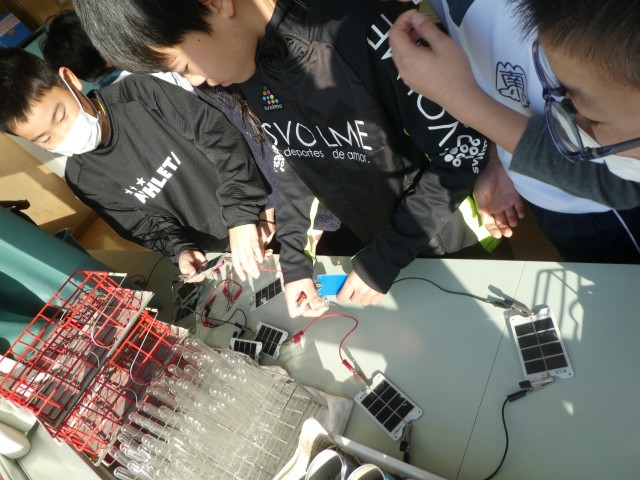 屋上で太陽光パネルが発電している様子を見ました。今日は実際に、実験で発電している様子を確かめました。光を当てるだけでモーターが動いたり、豆電球が光ったりする様子に感動です。さらに、4年生の学習でつなぎ方を工夫すると光り方や回り方が強くなること思い出して実験している子もいました。こういう場面で既習事項が生きるのが良いですね。