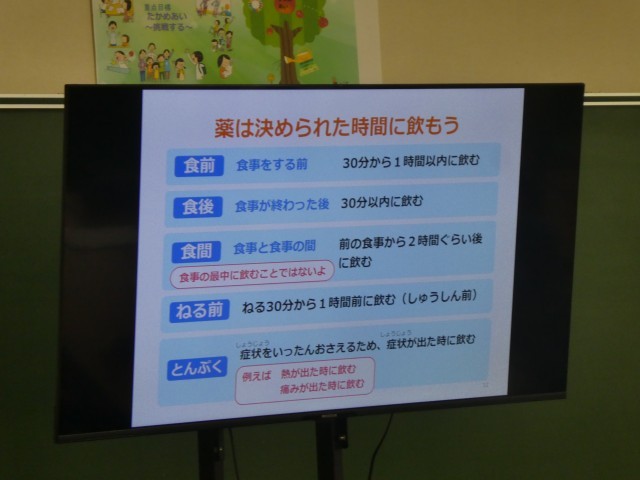 薬の正しい処方の仕方について学習しました。「食間」って食べている時の間ではないんですよね。また、薬をグレープフルーツジュースなどと一緒に飲んでしまうと、薬の成分が変化して効かなくなることもあるそうです。実験でも確認しましたね。