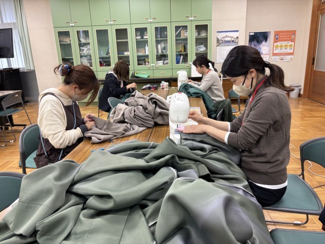 今日はサポーターさんに集まっていただき、体育館のカーテンの修繕をしていただきました。