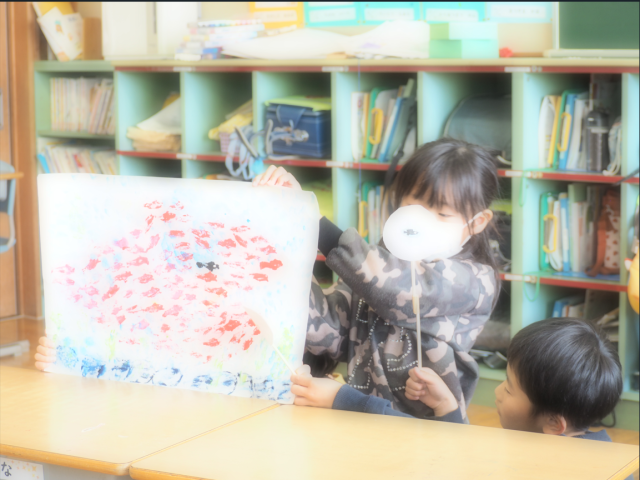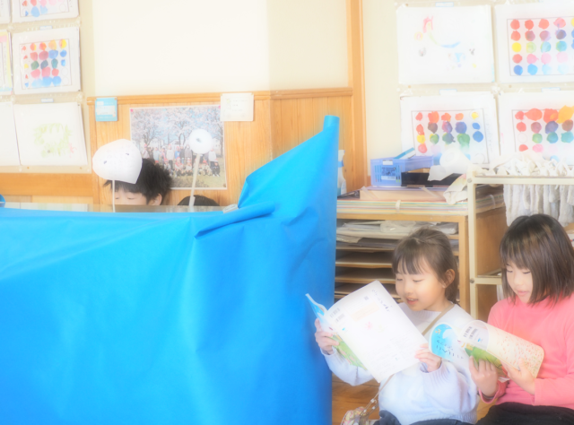ペープサート劇をすることになりました。同じグループのお友達と声を掛け合って、一生懸命練習中です。