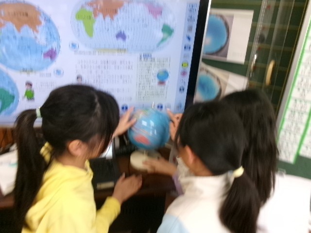 地球儀や世界地図を見て、国土の様子を調べます。海が広いね、大陸があるね、たくさんの発見がありました。