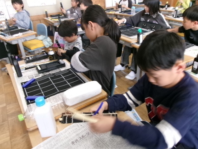 初めてのお習字。道具のならべ方からお勉強です。初めてさわる道具に、目をきらきら光らせて、丁寧に並べていました♪