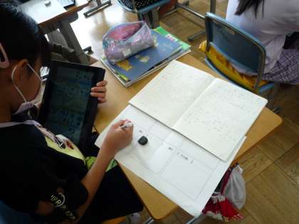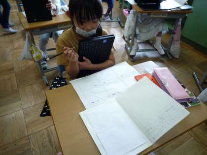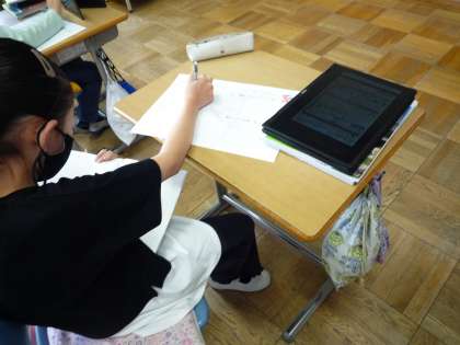 自分の家にあったごみを、裾野市のごみの出し方の表を見ながら、分別をしました。タブレットに映し出された資料とノートを一生懸命見比べて取り組んでいました。