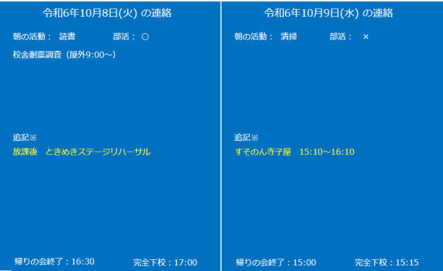 おはようございます。今日・明日の予定をご確認ください。
