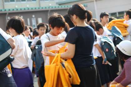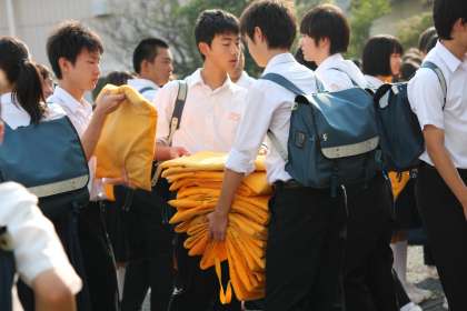 防災頭巾を回収する生徒と教師たち。