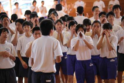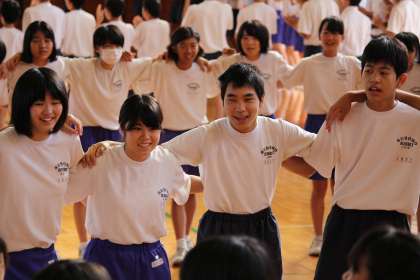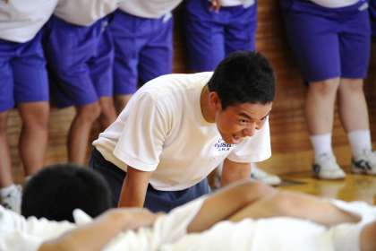 続いて、体育館中を使い、各カラーがリーダーの声かけのもと、