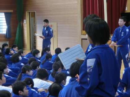 今朝は、表彰集会がありました。いつものように、各学級で健康観察を行い、整列した後、全校で朝の挨拶を交わしました。今回は、1団体、28人の表彰がありました。呼名に対するさわやかで大きな返事、整列の際の3C男子のまっすぐ伸びた腕など、気持ちのいい光景がみられました。そして、校長からは、冬至にまつわる話がありました。