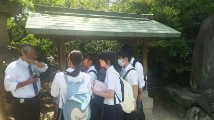 北野天満宮で運転手さんの説明をしっかり聞いています。