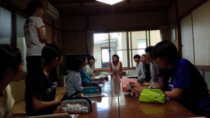 お世話になった民宿の方との交流会が始まりました。A組女子は自己紹介で自分の夢や頑張りたいことを自分の言葉で伝えることができました。