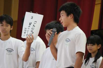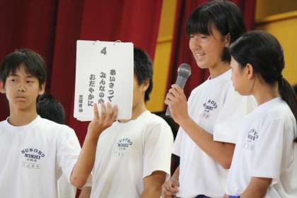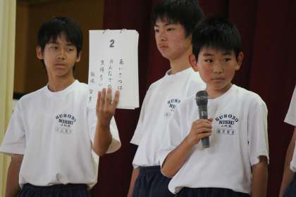 生徒から募集した「挨拶標語カレンダー」の発表では、