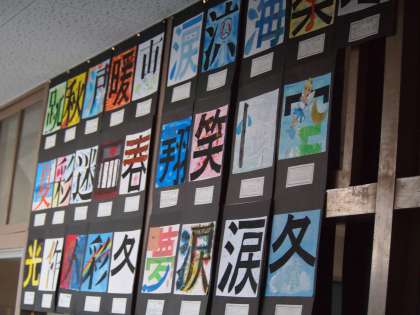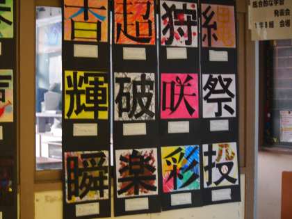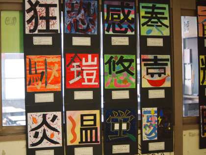 1年生の廊下には、美術の授業で作り上げた作品が、