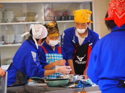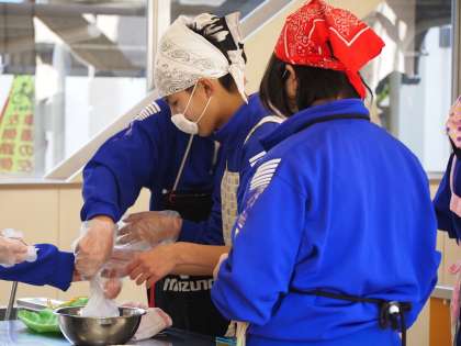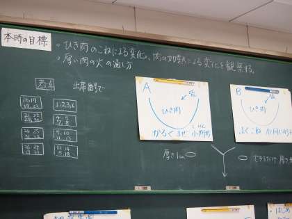 今日は、1年D組が、ひき肉のこね方による変化について、