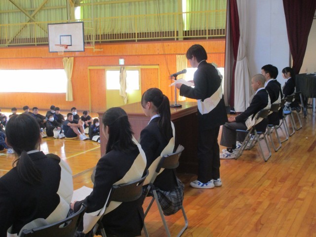 終業式では、各学年の生徒代表から、2学期にがんばったことや挑戦したことが発表されました。校長先生からは、2学期を振り返った上でうまくいかなかったことがあったとしても、それも次に生かせばよいので最後には○にしてあげましょうという話がありました。また、生徒指導主事から冬休みの生活のためのアドバイスもありました。