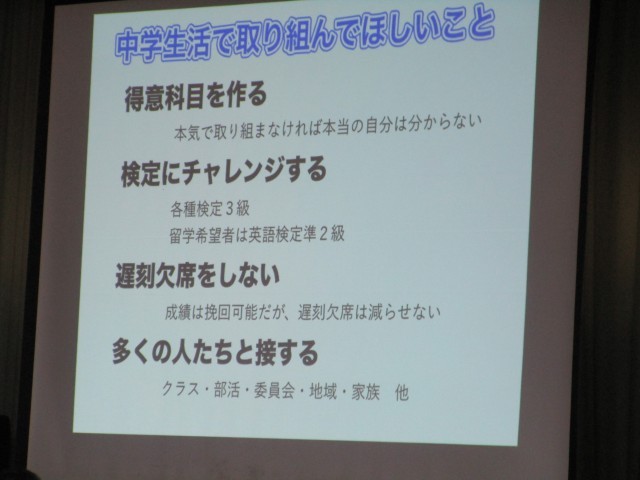 進路説明会(2年) 公開日 2026/02/06 更新日 2026/02/06 二年部より 2年生の親子を対象に進路説明会を行いました。高校の先生を招き、高校の特徴や入学までの心構えなどを教えていただきました。学年主任からは、受検までの日程や内容などの説明がありました。私立高校の入試まで一年を切りました。「受検にフライングはない」「ゴールまでの距離は人それぞれ違う」など、担任からの激励もありました。今日の説明会が、自分の進路について考えるスタートとなりました。 いいね(0)