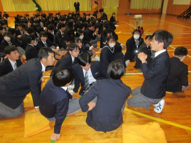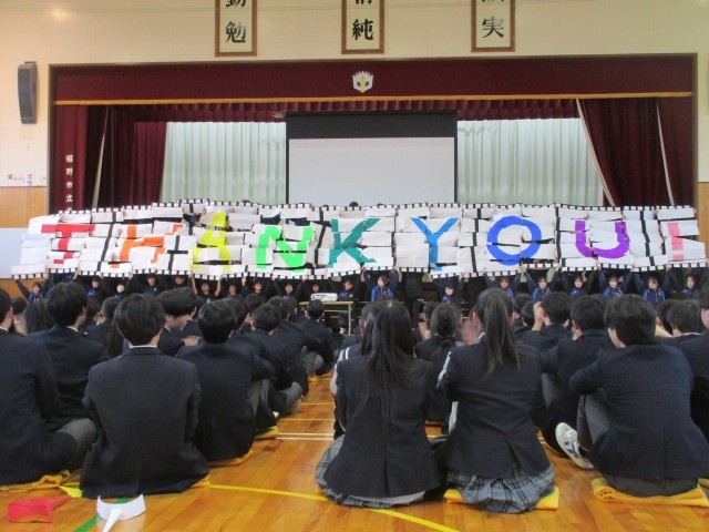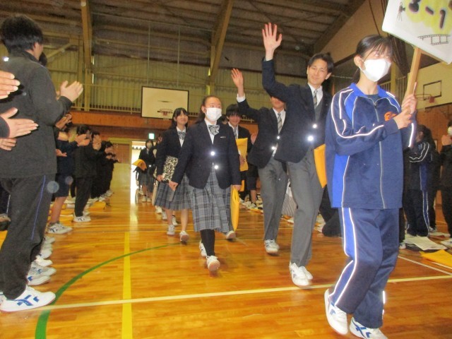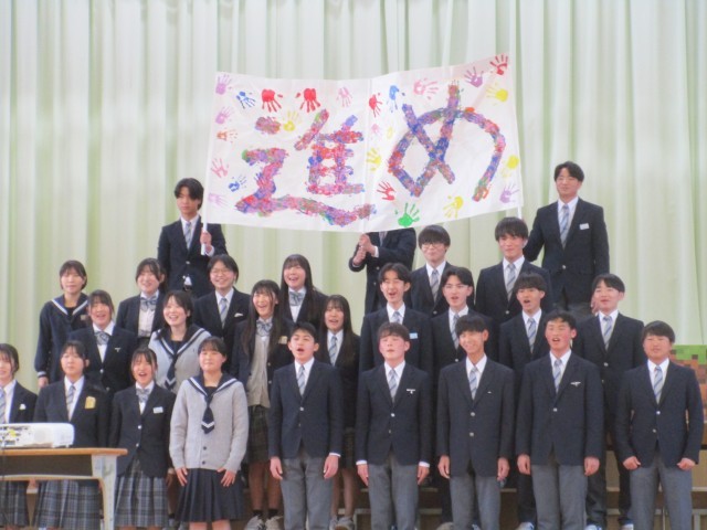 生徒会主催の3年生を送る会を行いました。1・2年生が3年生に感謝の気持ちを伝えようと工夫を凝らした内容や演出で会が進行しました。スライドショーやクイズで中学校3年間を振り返ったり、感謝の気持ちを伝える呼びかけ、コレオグラフィーで会を盛り上げました。3年生からも、劇や合唱でお礼の気持ちが伝えられました。最後は、桜吹雪が舞う中、3年生が退場しました。1・2年生も、3年生も笑顔いっぱいの心温まる会となりました。