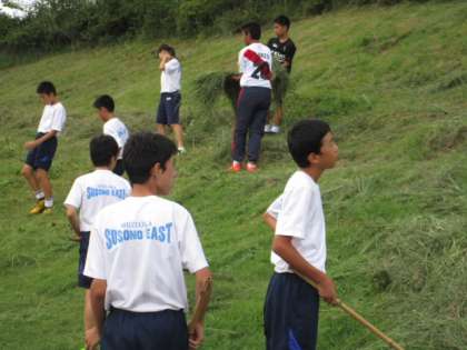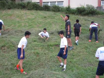 先日、奉仕作業が雨のため中止になりました。そこで、職員が草刈りをし、子どもたちが一輪車等を使い処理をしてくれていました。感心するほど、一生懸命取り組んでいました。