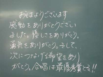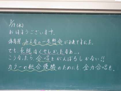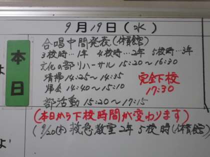 さわやかな朝を迎えています。先日、体育の部の応援をしていただき、ありがとうございました。子どもたちの一生懸命の姿は、大変良かったと思います。また、当日を迎えるまで、そして当日、大きなけがもなく、無事終了することができました。保護者の皆様に感謝いたします。次は、9月29日(土)文化の部があります。お忙しい中ですが、子どもたちの一生懸命歌う姿をご覧ください。本日は、各学年の合唱コンクールの中間発表会が行われます。