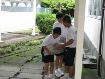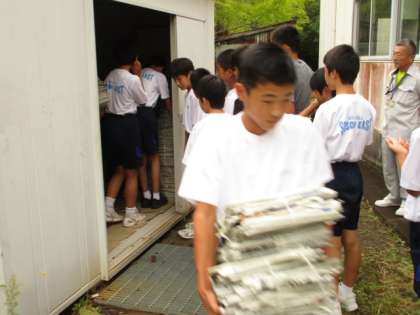 午前7:10頃より、野球部の生徒たちが、技術科室の裏の倉庫より、技術科室前に古紙を運んでくれました。部長を中心に、手際よく、気持ちよく作業してくれました。