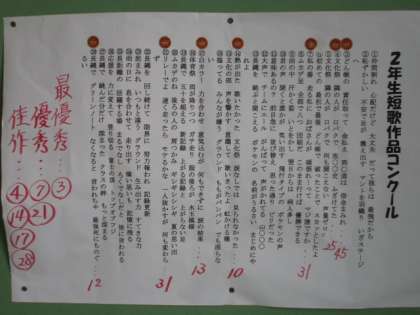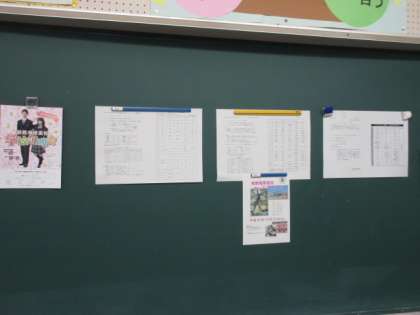 上段:見にくいでしょうか。3年生の黒板に、高校説明会の案内のパンフレットが掲示されています。本格的に始まっています。あと2ヶ月くらいで、自分の進路を決定することになります。
