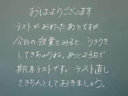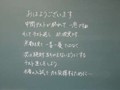 子どもたちは、中間テストが終了し、ほっとしているところですが、期末テストまであと23日です。特に、3年生は、踏ん張りどころです。毎日の授業を大切にしていく必要があります。力をつけるには、毎日こつこつと、取り組んでいくしかないのです。