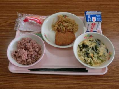 赤飯、ごま塩・牛乳・ヒレカツ2個・切り干し大根の炒め煮・かき玉汁・桃のミルクレープです。