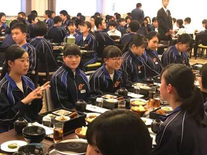 修学旅行2日目の夕食が始まりました。和食です。