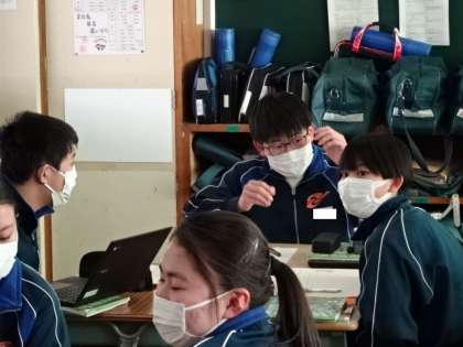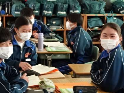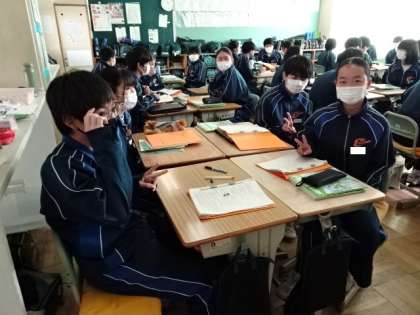 3年生の英語の授業風景です。1,2年生の授業風景でもお分かりのように、すぐに会話ができるよう、グループになっています。今回は、電子黒板でいろいろな教員にインタビューした動画を流し、そのことについての質問に答えるという授業でした。