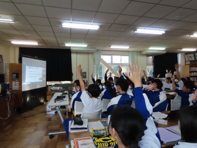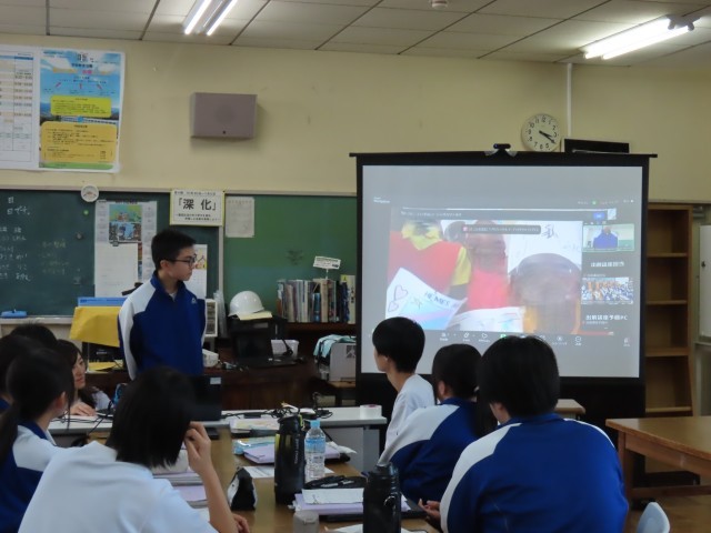JICA様と裾野市役所のご協力を得て、ウガンダの小学生とオンラインで平和について考える学習を行いました。ウガンダに派遣されている海外協力隊員の方から難民支援活動や難民居住地についてのお話を伺い、共生社会について考えました。その後、日本やウガンダの生活について、それぞれ英語で紹介し合いました。