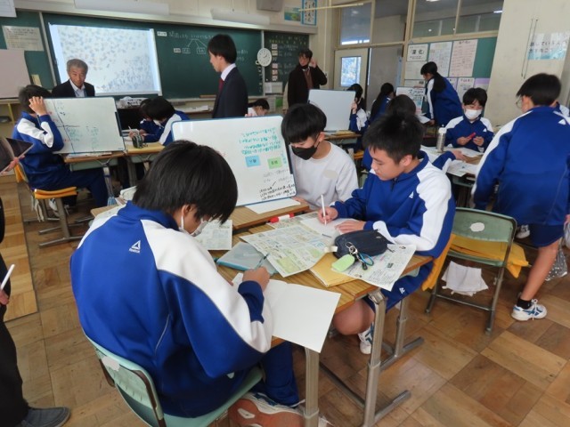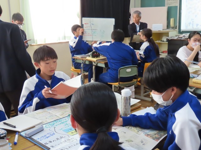 市内の社会科の先生方による授業づくり研修会がありました。グループになって意見を出し合い、他の班の意見を聞き取り自分の班で考えを深めたり広げたりしました。上手に友だちに説明することができました。