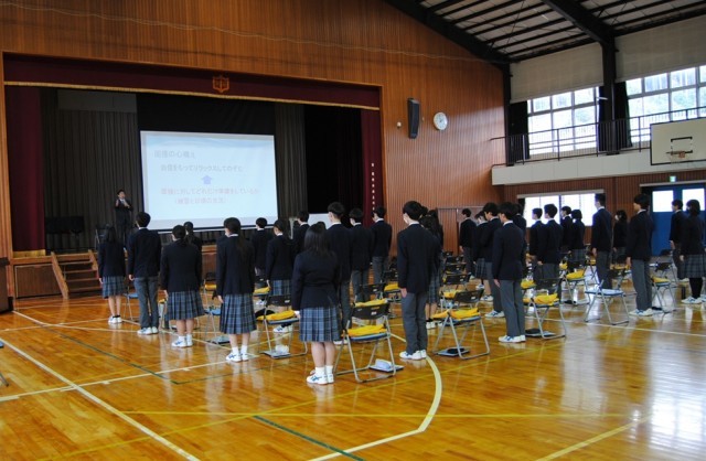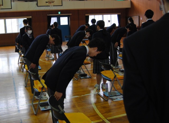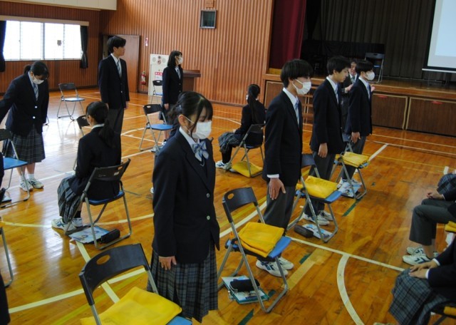 3年生は、高校の先生を招いて面接講習に取り組みました。まずは、全員で礼の仕方について確かめました。きれいに背中を伸ばしてする挨拶は、素晴らしかったです。