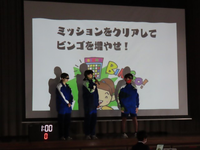 生徒会スローガン「自」 自分から関われるようにしていくことを実行するため、生徒会役員の皆さんが異学年交流の企画を考えました。「MISSION BINGO」という企画で、各生徒がランダムに記入した数字に対して、生徒会役員が考えたMISSIONを他学年の生徒と一緒にクリアしていくというものです。積極的に話しかけ交流している姿がとても生き生きとしていました。