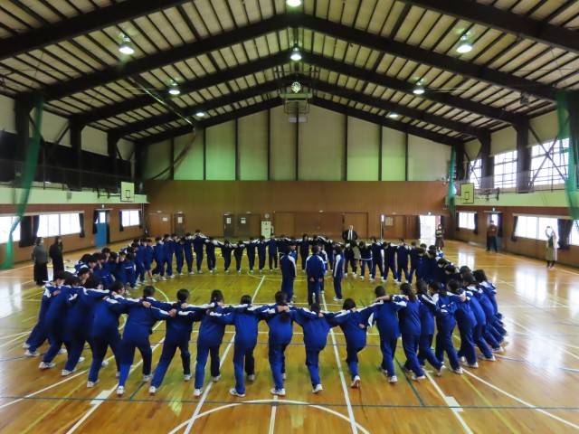 三年生を送る会に向けて、1・2年生合同で決起集会を開きました。