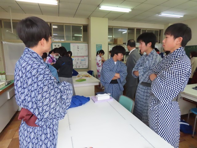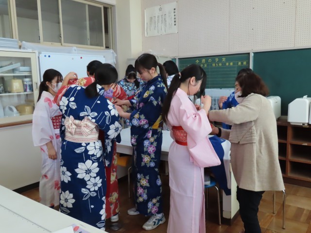 着付けボランティアさんのお力を借りて、家庭科の授業で着付けの練習をしました。