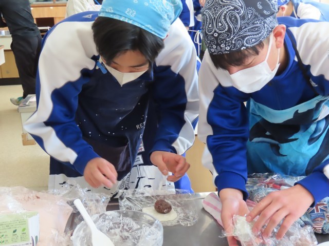 家庭科では、いちご大福作りを行い、やわらかいお餅に苦戦しながら頑張っていました。