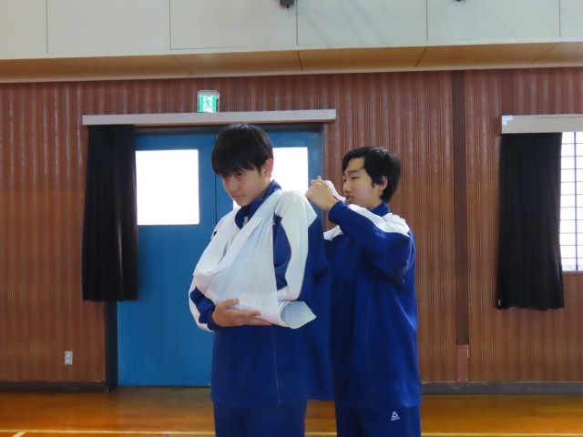 体育では、三角巾の使い方の練習をやっていました。いざというときに役に立ちますね。