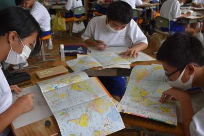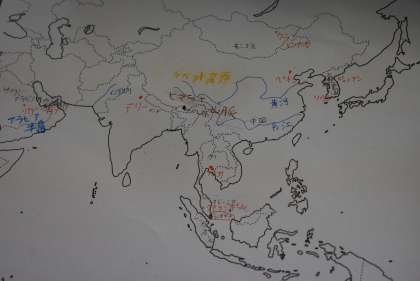 黄河、長江、インダス川、ゴビ砂漠、チベット高原、ヒマラヤ山脈、アラビア半島、エベレストを地図帳で調べ、白地図にうめていきます。